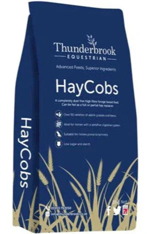 Thunderbrook Equestrian Haycobs are a premium, dust-free, high-fibre forage feed designed to support digestive health and overall wellbeing in horses. Made from dried alpine grasses and herbage, these highly compressed cobs can be fed dry without pre-soaking, making them versatile as a hay replacer, part of the daily ration, or even as a healthy hand-fed treat.