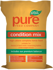 If you're looking for a top-notch horse feed to help improve your horse's condition, look no further than Pure Condition from Pure Feed Company. This fibre-based feed is powered by oil, providing your horse with slow-release energy and promoting positive behaviour. Not only does it help with developing topline and muscle, but it also contains a premium natural balancer that gives your horse all the vitamins, minerals, amino acids and trace elements they need for a healthy hind gut, a shiny coat and strong hoof development. Plus, it's low starch and suitable for horses with gastric ulcers. Best of all, it's a complete feed, so you won't need to buy a separate balancer or any other product. It's great value and saves you mixing time, so you can enjoy more time with your horse. Feeding rate: 400-600g per 100kg body weight depending on condition and work done. We recommend dampening with water before feeding.