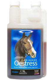 NAF OESTRESS LIQUID 1 LITRE. Helps the mare to balance her oestrus cycle naturally by targeting the root causes of her discomfort which lead to her moods. When to feed: Feed wherever seasonal behavioural changes and tension are seen in mares. Ingredients: Water, Magnesium chloride, Aromatic and appetising herbs, Products of tubers and roots, Products of fruits, Xanthan gum, Flavour (aniseed), Hydrolysed lecithins.