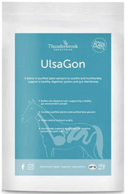 Thunderbrook Ulsagon is a natural equine supplement designed to soothe and support a healthy digestive system and gut lining, helping to maintain an optimal stomach environment and reduce discomfort associated with gastric ulcers. It contains purified pectins and beta-glucans, which act as soluble fibres to buffer the digestive tract and promote beneficial gut flora, supporting the gastrointestinal lining and overall gut health.