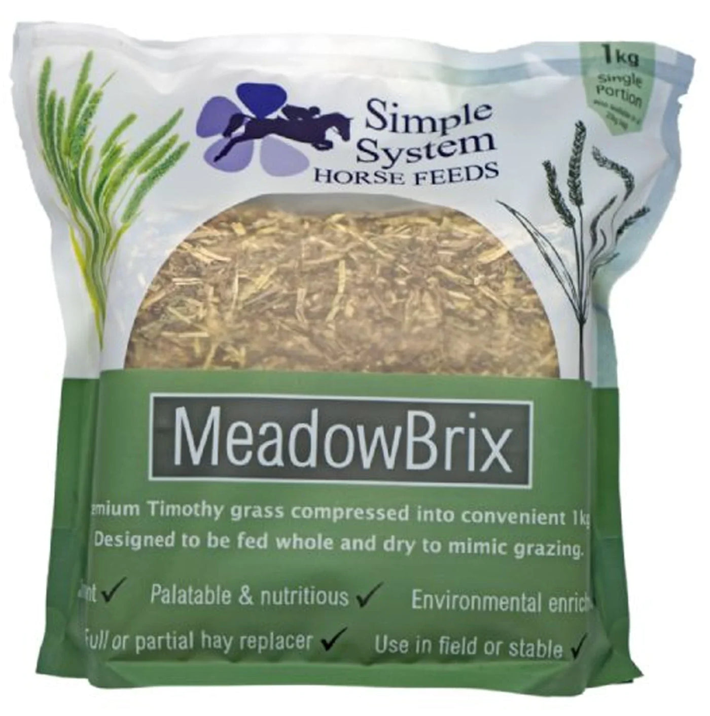 Simple System New MeadowBrix is made from mature Timothy Grass compressed into convenient 1kg blocks, designed to be fed whole and dry to mimic natural grazing. Perfect for encouraging chewing and keeping horses occupied, it can also be used as a partial or complete hay replacer.