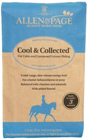 Allen & Page Cool & Collected is a high-fibre, low-starch horse feed, specially designed for horses and ponies at rest or in light to medium work. Perfect for those prone to excitable or fizzy behaviour, this feed provides slow-release energy from fibre and oil, helping to maintain calmness and stamina without the highs and lows of traditional cereal-based diets.