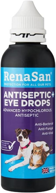 RenaSan Antiseptic Eye Drops provide effective eye care for all pets and animals. This innovative natural solution eliminates 99.9999% of germs on contact. With powerful antibacterial, antiviral, and antifungal properties, it is gentle enough for use in the eyes. Made with hypochlorous technology, RenaSan contains only water, salt, and hypochlorous acid.