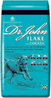 Dr John Flake with Chicken is a complete, balanced dry dog food formulated for lightly active adult and senior dogs. Made in the UK from toasted wholegrain flakes and crunchy biscuits basted in chicken juices, it provides steady, slow-release energy and is highly palatable.