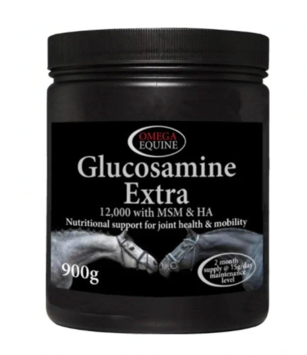 Glucosamine, a naturally occurring amino-sugar in a horse's body, plays a key role in maintaining healthy cartilage while also benefiting collagen, joint fluid, tendons, and ligaments. Omega Glucosamine Extra is enhanced with MSM and hyaluronic acid (HA) for optimal joint support. As glucosamine levels naturally decrease with age or increased activity, adding a supplement can be a valuable way to provide additional joint care.
